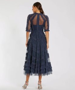 An a-line midi dress with a high neckline, 3/4 sleeves, and tiered ruffles for a graceful, modern silhouette. Perfect for garden parties, brunches, and daytime events.