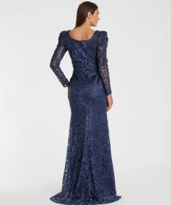 This stunning lace applique trumpet gown boasts a fully lined bodice and an embellished waist detail. The semi-sheer unlined sleeves add a touch of elegance, while the scoop neckline and long sleeves with puff shoulders add a touch of drama.