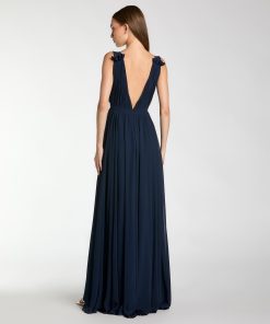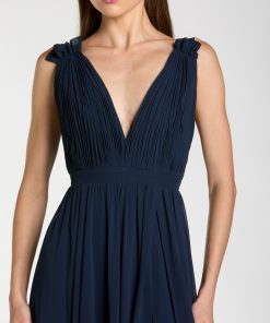 Ruched chiffon maxi dress with a plunging v-neckline and thigh high slit.