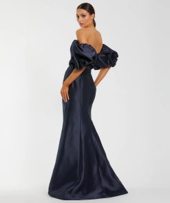 Crafted from elegant satin, this off-the-shoulder gown features puff sleeves and a sweeping train for a timeless silhouette.