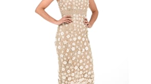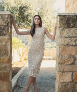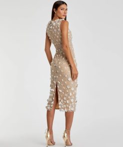 Shop this stunning sleeveless midi dress, featuring an embellished lace overlay with intricate 3D flowers. The hand-beaded waist adds a touch of elegance and creates a flattering silhouette. Perfect for formal occasions, weddings, or evening events, this dress combines delicate craftsmanship and modern style for a truly standout look.