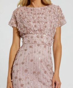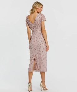 Make a statement in this stunning midi dress, crafted from hand-embellished mesh with an all over delicate floral beading that adds charm and elegance. The cap sleeves and V-shaped back accentuate the feminine design, while the sheath silhouette offers a flattering, streamlined fit. Perfect for any special occasion, this dress is sure to turn heads and leave a lasting impression.