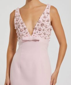 Embody elegance in this beaded crepe gown. Crafted from quality crepe fabric, it features a stunning beaded bodice and a delicate bow detail, making it the perfect look for any evening affair.