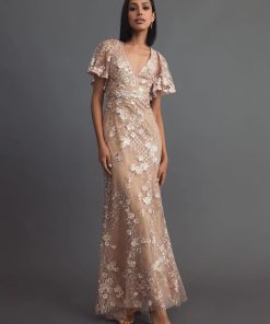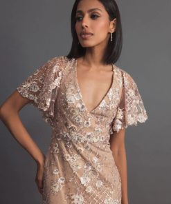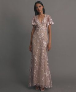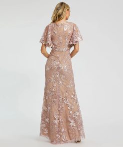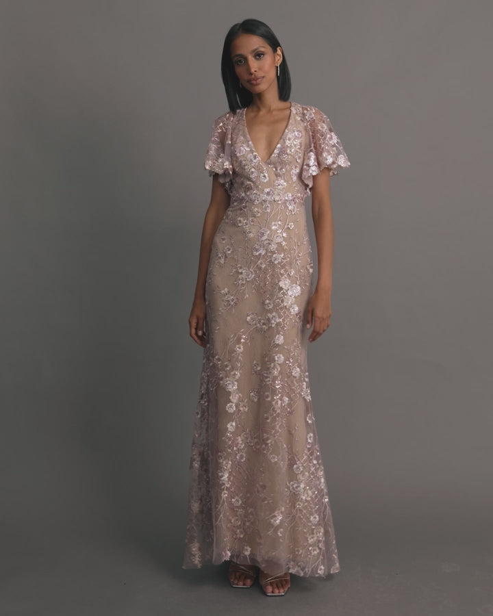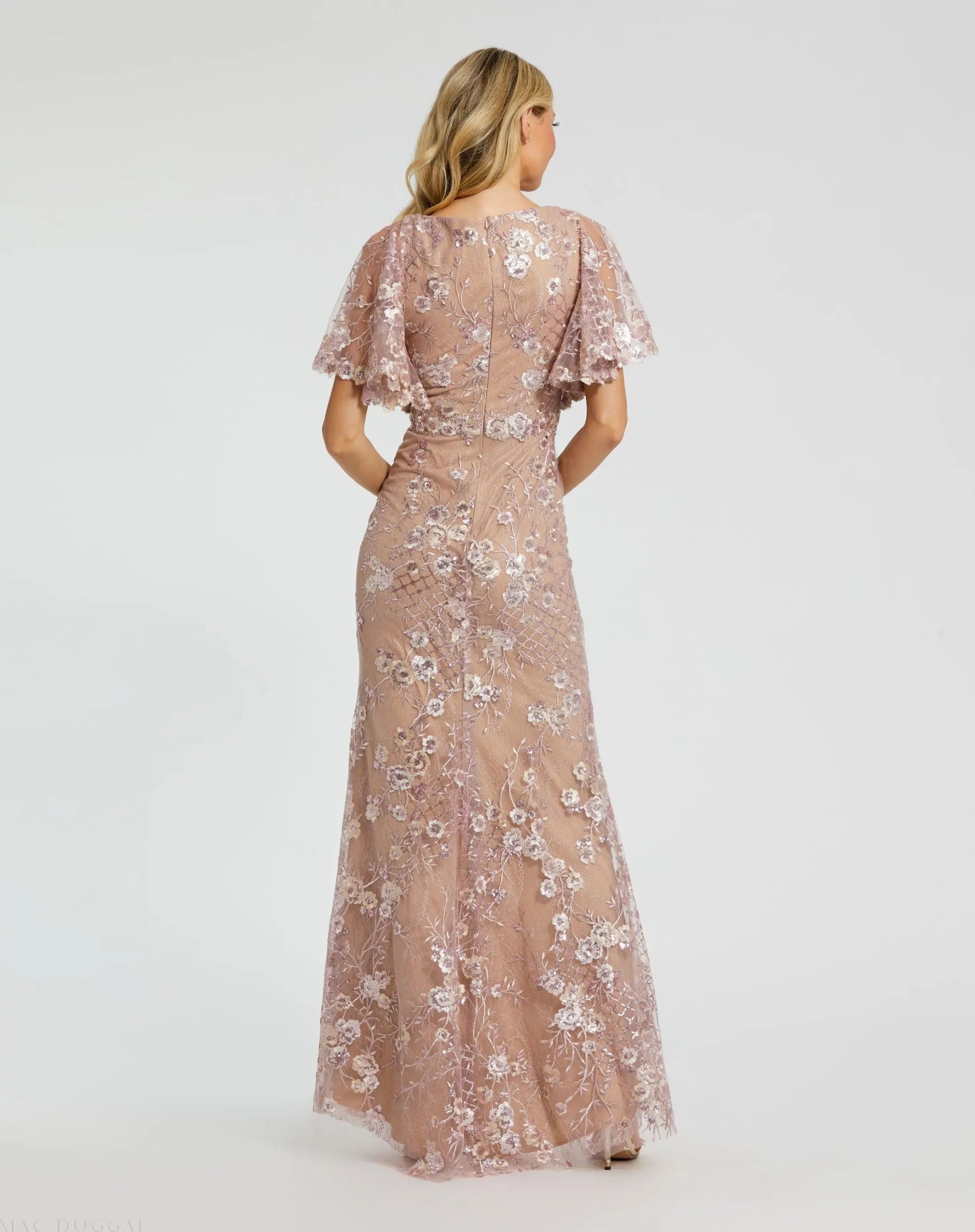 This stunning lace gown features a feminine neckline, short butterfly sleeves, and subtle floral sequin embellishments, making it a perfect, timeless choice for any formal occasion.