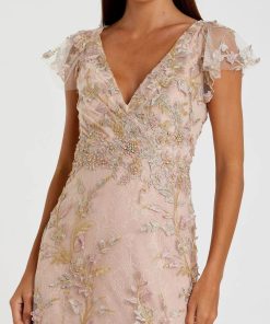 This elegant gown features intricately embroidered fabric, elegantly crafted to add a touch of sophistication to any event. The flutter sleeves and v-neckline create a flattering silhouette, making this dress a perfect choice for formal occasions.