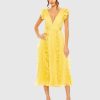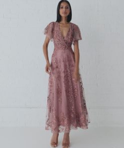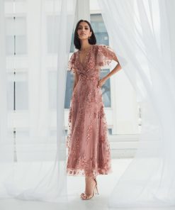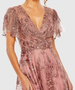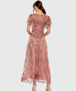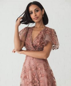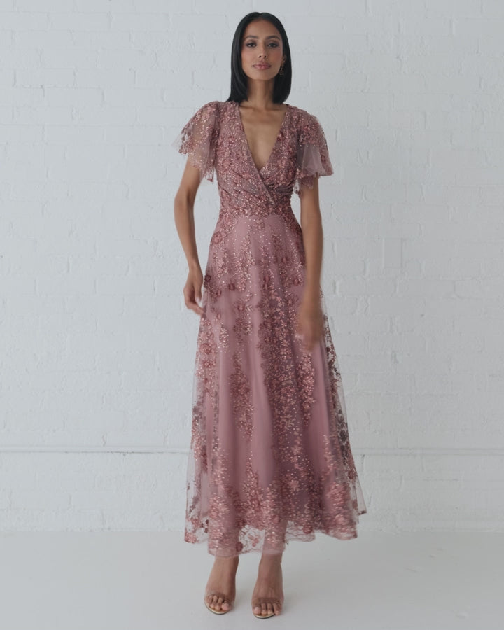 This elegant embroidered dress features a faux-wrap bodice, flutter sleeves, and heat-set rhinestones for subtle sparkle throughout.
