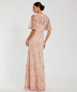 Mac Duggal Women’s Dresses Pink Flutter Sleeve Floral Embroidered Net Gown | Rose