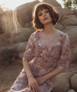 Adorned with 3D rosettes, beading, and pearls, this evening gown exudes glamour and sophistication. Featuring a high illusion neckline, sheer 3/4 sleeves, and a flattering a-line silhouette, it’s perfect for making an entrance at any formal occasion.