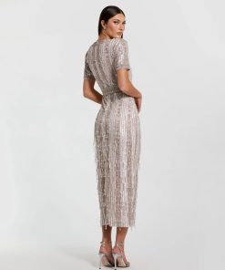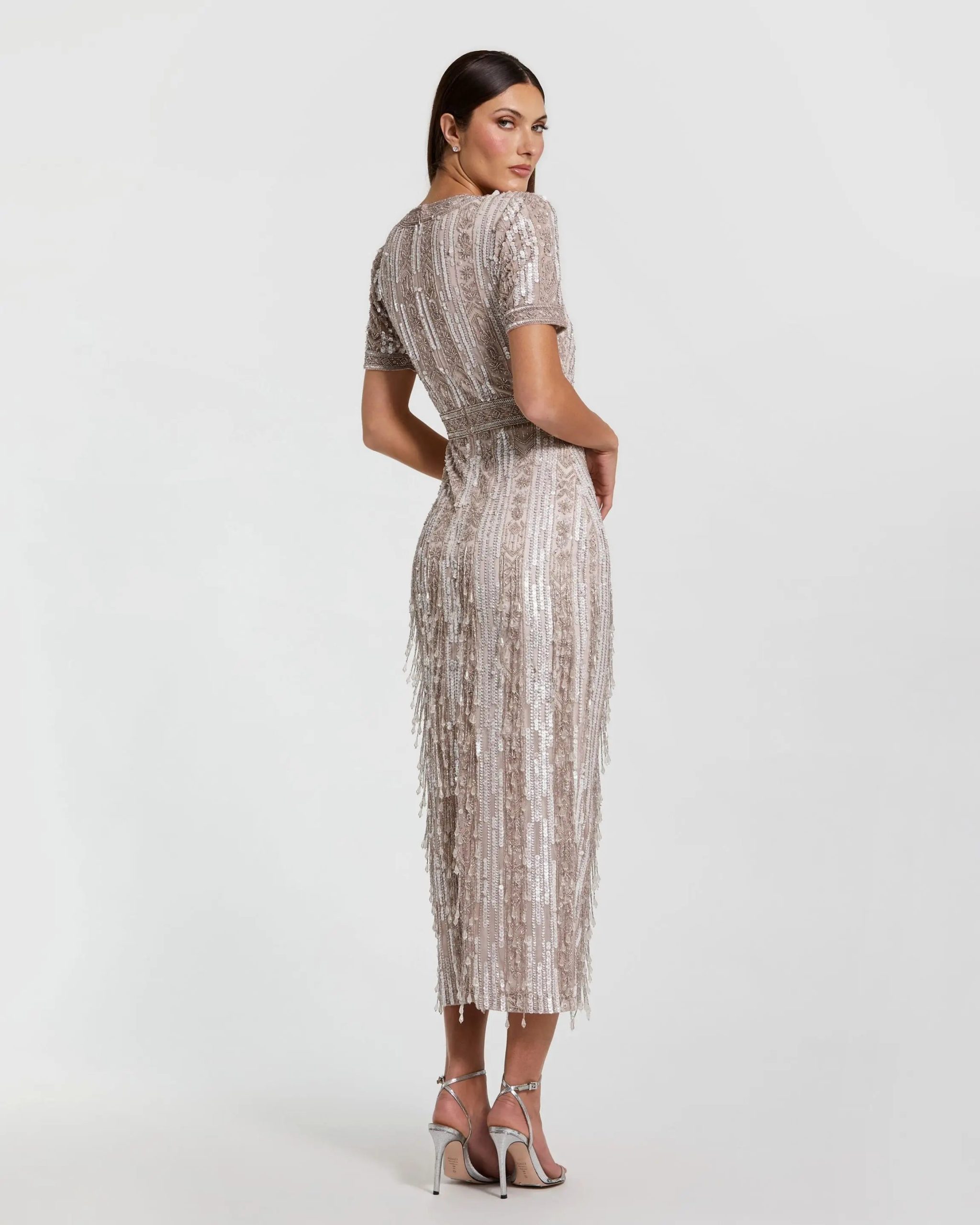 Upgrade your evening look with our High Neck Short Sleeve Crystal Fringe Sheath Dress. The embellished fabric glimmers under the lights, while the high neckline and sheath silhouette create a sophisticated silhouette. The crystal fringe adds an extra touch of glamour for a truly stunning ensemble.