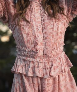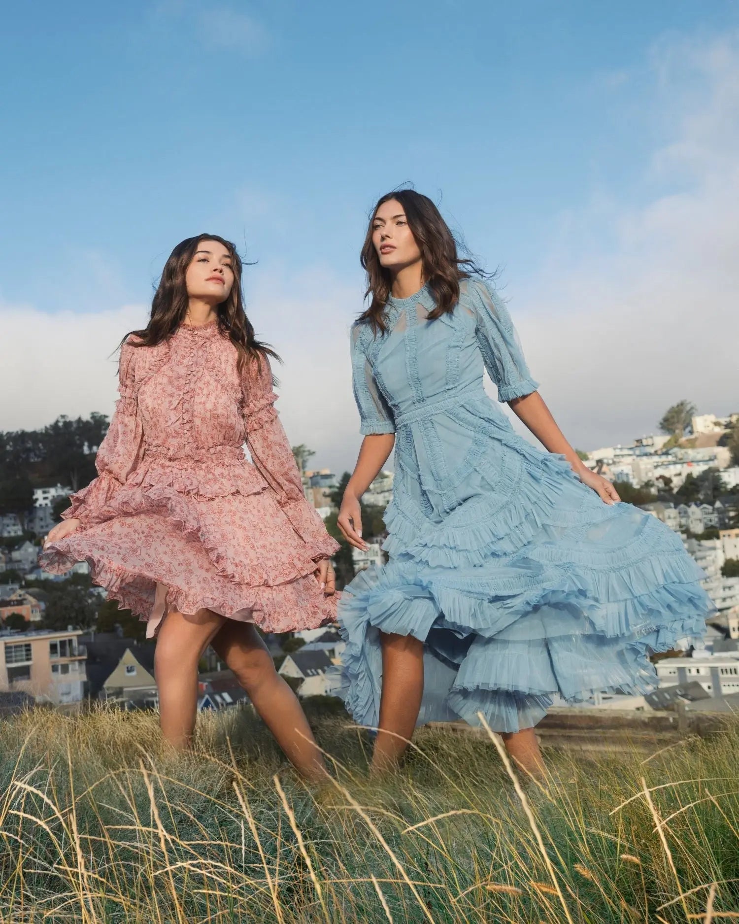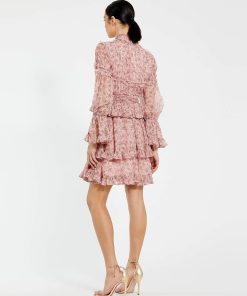 This floral-printed chiffon mini dress features a mock neck with button details, long flared sleeves, and allover ruffles, adding movement and creating an elegant, feminine silhouette perfect for any daytime occasion.
