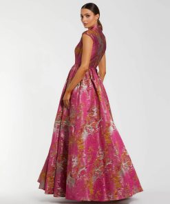 Make a statement in this regal raspberry jacquard ball gown, woven with metallic gold and silver threads for rich depth and drama. The structured bodice and full A-line skirt create a timeless silhouette perfect for galas, black-tie events, and mother of the bride moments.