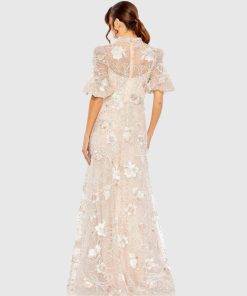 Radiate elegance in this shimmering A-line gown, featuring a Queen Anne neckline, sheer puff sleeves, and exquisite floral embroidery with embellished details, perfect for formal and evening events, and enchanting occasions.