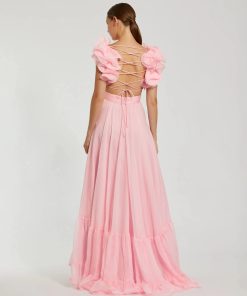 The Mac Duggal Iconic Ruffle Gown. Floor length tiered gown with daring side cutouts, a lace-up back, and dramatic ruffles at the shoulder. This best selling silhouette is flattering on most body types and easily adjustable for the best fit.