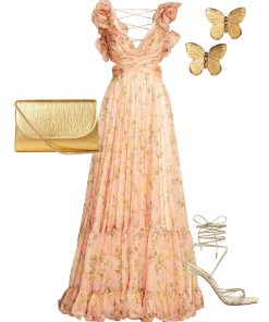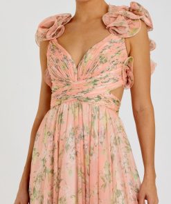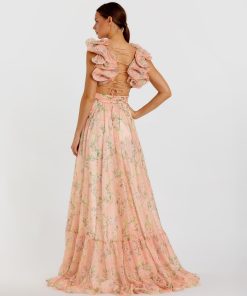 Mac Duggal Women’s Dresses Pink Ruffle Tiered Floral Cut-out Chiffon Gown | Pink Multi