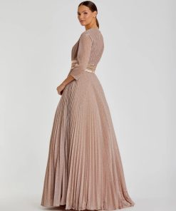 This sparkling structured ballgown features a pleated bodice and a flattering ballgown skirt. The semi-sheer 3/4 sleeves hit mid-forearm, while a dramatic embellished waistband defines the waist, adding a touch of glamour. Perfect for formal events, galas, or special occasions.