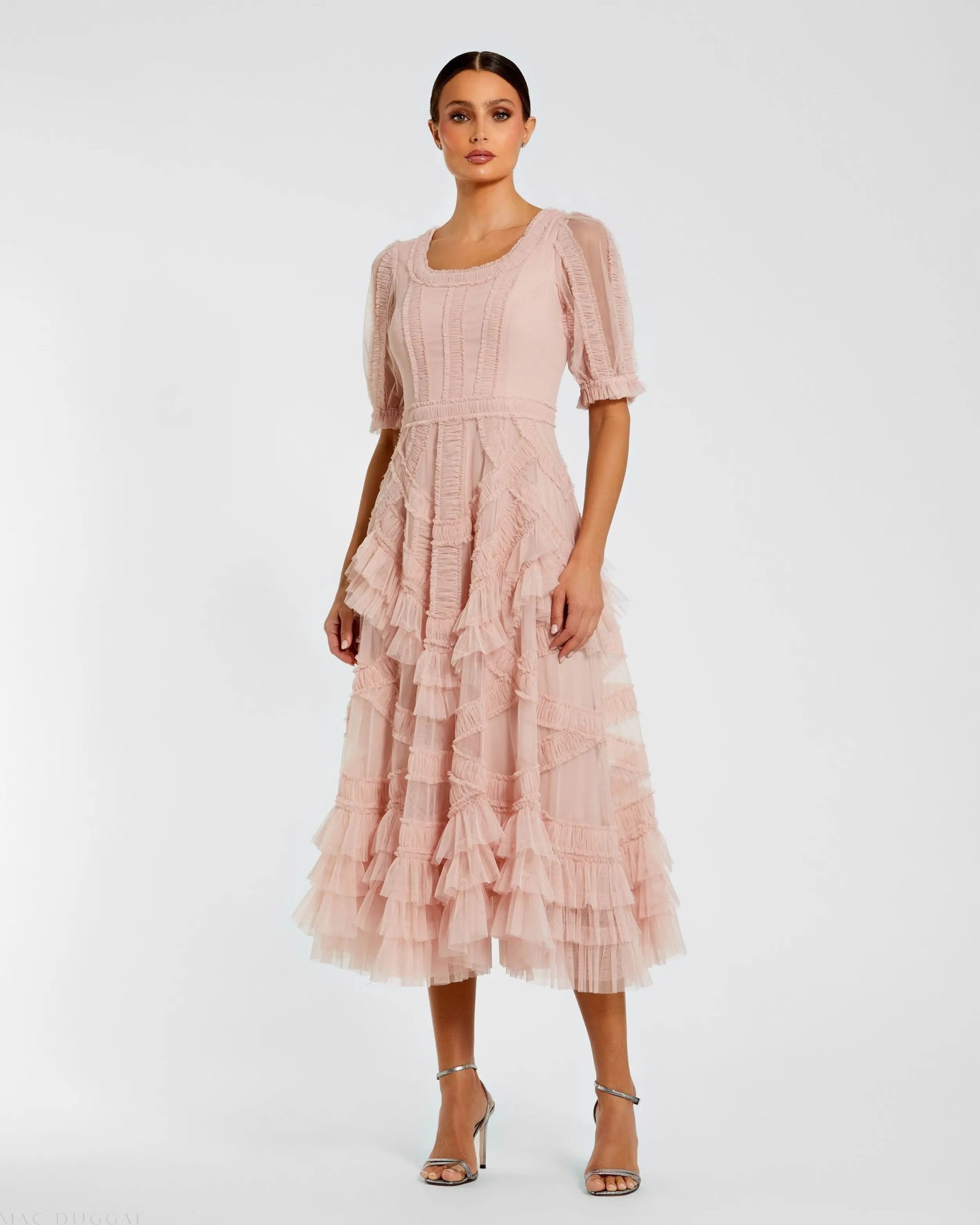 Mac Duggal Women’s Dresses Pink Short Sleeve Mesh Micro Ruffle Midi Dress | Porcelain