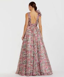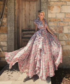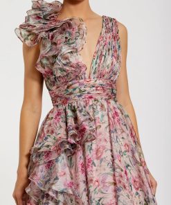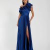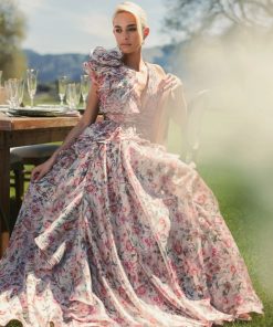 Make a statement in this beautiful chiffon ball gown, featuring a dramatic one-shoulder ruffle and plunging V-neckline. Vibrant and unforgettable, it’s a showstopping choice for galas, weddings, or any special occasion.