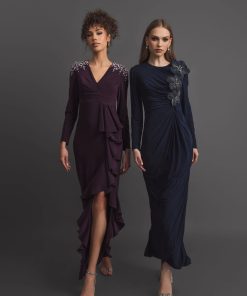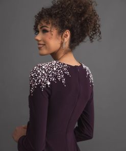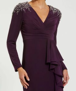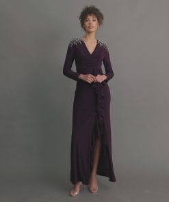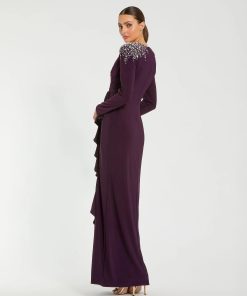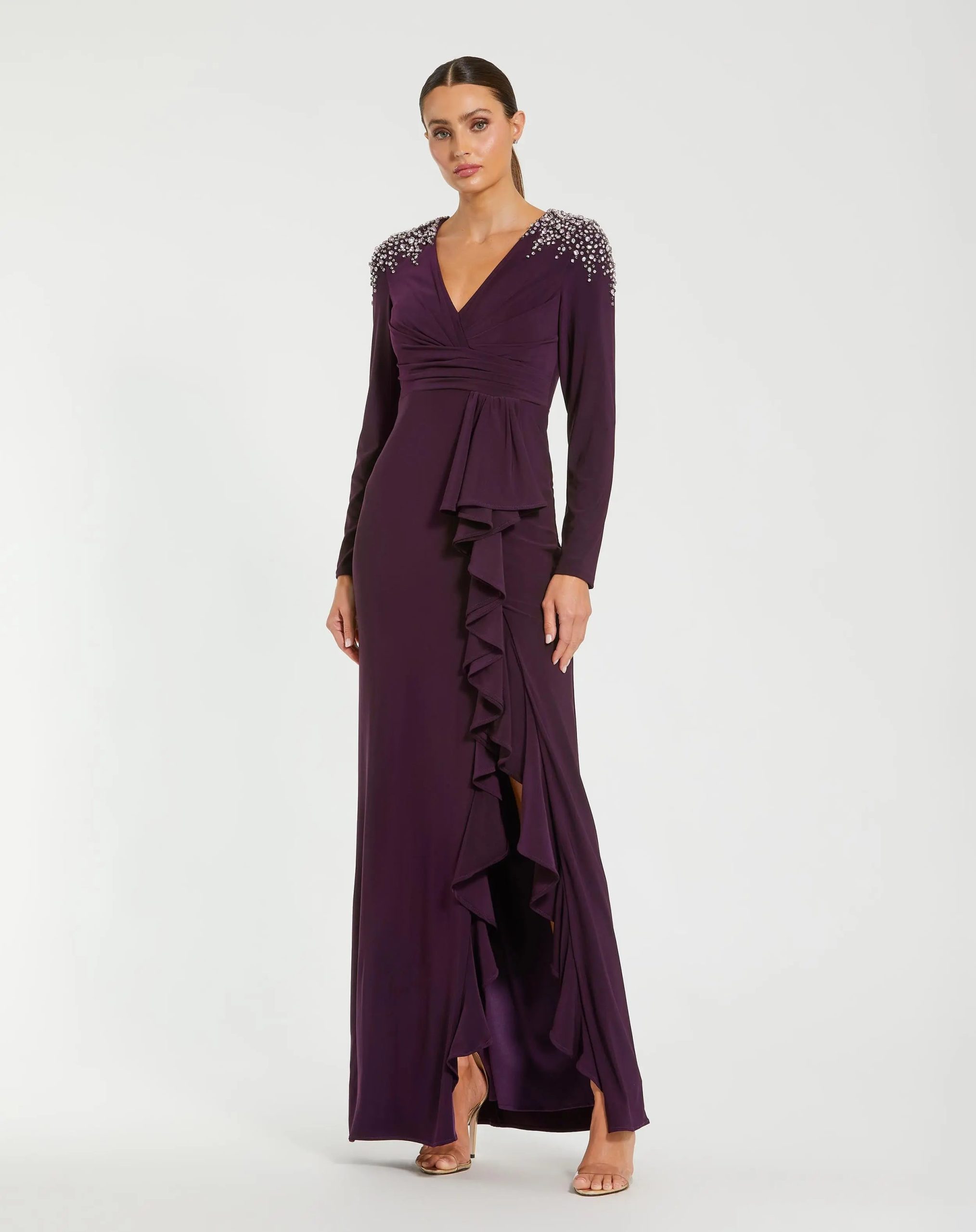 Make a stunning entrance in this long sleeve gown with rhinestone-embellished shoulders, a cascading side ruffle, and a high slit, perfect for galas, weddings, and formal events.