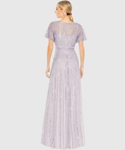 Indulge in enchanting elegance with this flowy A-line dress adorned in cascading sequins, accentuated by a shimmering waistband. The delicate short butterfly sleeves and captivating deep v-neckline make this dress perfect for summer and spring weddings.