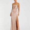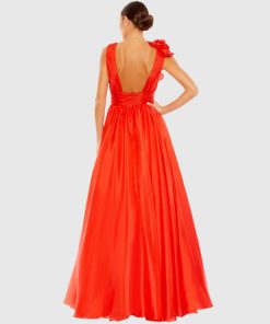 V-neck sleeveless ball gown with ruffled shoulder ruched empire waist and ruffles flowing down the skirt.