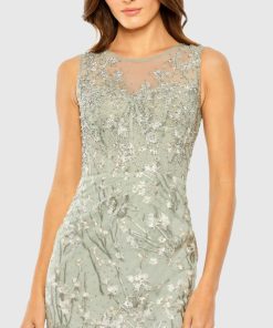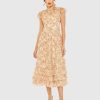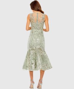 This trumpet midi dress with a striking silhouette, intricate embroidery, embellishments, and a flattering corset is perfect for daytime weddings, cocktail soirées, and elegant events.