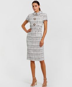 Mac Duggal Women’s Dresses White Fitted Boucle Short Sleeve Button Up Midi Dress | White