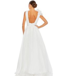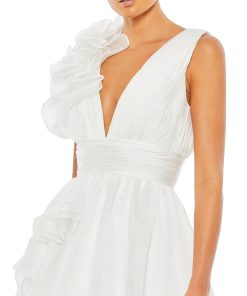 V-neck sleeveless ball gown with ruffled shoulder ruched empire waist and ruffles flowing down the skirt.