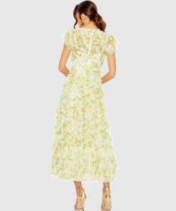 This enchanting dress features a floral-printed mesh overlay, adding a soft, romantic touch. The partially lined bodice and fully lined skirt ensure comfort, while the sheer unlined sleeves offer an airy, delicate feel. The illusion high neckline enhances the sophisticated design, and the short ruffled cap sleeves provide a playful, feminine touch. Allover ruffled frill detailing and an A-line silhouette complete the look, creating a flattering and elegant style perfect for weddings, garden parties, or any special occasion.