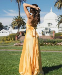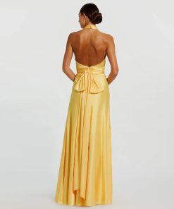 - Open back with self-tie bow