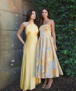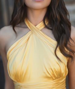 Crafted from luxurious satin fabric, this gown features a flattering cross halter neckline and elegant ruched detailing. The open back, accented with a self-tie bow, adds a glamorous touch. Perfect for any formal event, this gown combines sophistication and style for a stunning look.