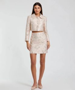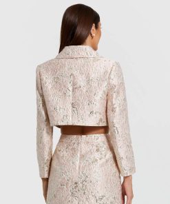 The Pearl Button Brocade Cropped Jacket offers a luxurious touch with its intricate brocade fabric and elegant pearl buttons. This chic cropped design adds sophistication to any ensemble, making it perfect for elevating your look with a touch of timeless charm.