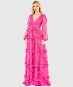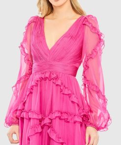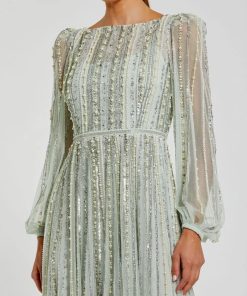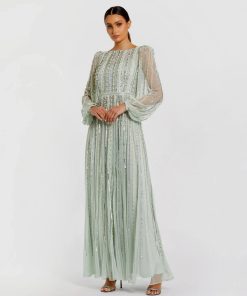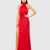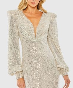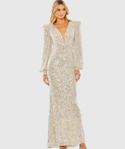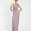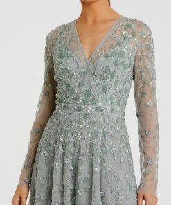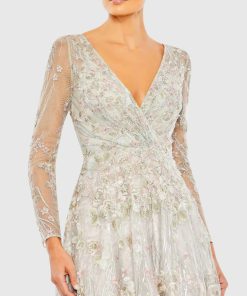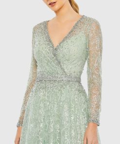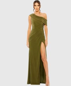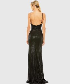 Striking metallic jersey spaghetti strap gown with a faux-wrap bodice, plunging v-neckline, and a floor-length skirt with a sweeping train.