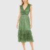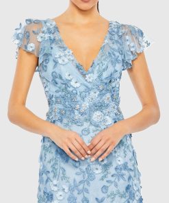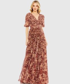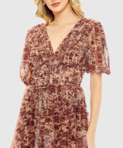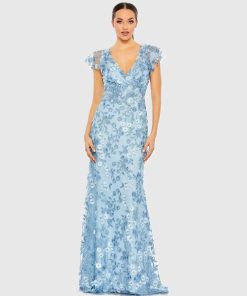 The Mac Duggal Iconic Ruffle Gown. Floor length tiered gown with daring side cutouts, a lace-up back, and dramatic ruffles at the shoulder. This best selling silhouette is flattering on most body types and easily adjustable for the best fit.