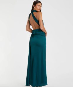 Experience sophistication in this stunning Open Back High Neck Side Ruched Gown. Crafted from luxurious satin fabric, it features a halter neckline, ruched waist detailing, and a thigh-high slit, making it the perfect gown for any special occasion.