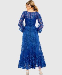 A lovely choice for cocktail parties and weddings, this beautiful embroidered dress features a v-neckline, sheer long sleeves, and allover crystals for a glamourous touch.