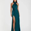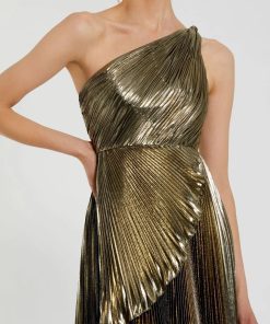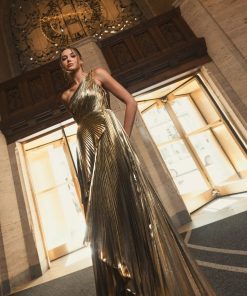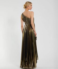 This stunning Pleated Metallic One Shoulder High Low Gown features a unique one shoulder neckline. The pleated metallic fabric adds a touch of glamour, while the high low ruffle hem adds a modern and chic twist. Perfect for any special occasion, this gown is sure to turn heads.