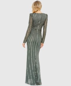 Made in an ultra-fine tulle fabric, this floor-grazing dress is embellished with rays of sequins. A sleek column shape with a high neckline and fitted long sleeves delivers a chic, contemporary look, while a beaded belt encircles your waist for a flattering fit.
