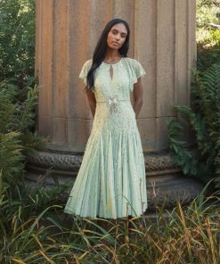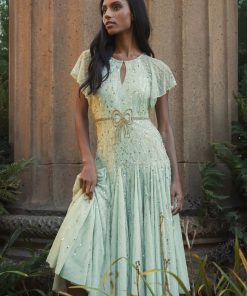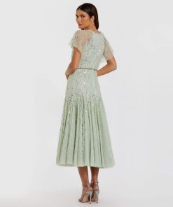 Adorned with intricate beading and sparkling star sequins, this a-line midi dress exudes feminine charm. The short flutter sleeves add a delicate touch, while the rhinestone bow adds a glamorous flair to your look.