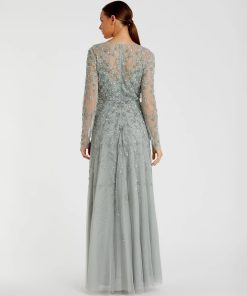 This gorgeous surplice gown is crafted with a sheer mesh overlay adorned with 3D floral embellishments across the bodice, arms, and skirt. With a v-neckline, sheer long sleeves, and a flowing skirt, this dress is an elegant choice for your next event.