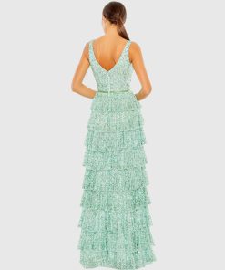 Crafted from sequin-embellished mesh, the gown is styled with a surplice bodice, sleeveless shoulders, and a tiered A-line skirt with just enough volume. A slim, beaded waistband offers a dazzling touch and unites fitted top and ruffled bottom.