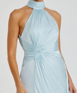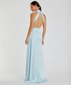 Experience sophistication in this stunning Open Back High Neck Side Ruched Gown. Crafted from luxurious satin fabric, it features a halter neckline, ruched waist detailing, and a thigh-high slit, making it the perfect gown for any special occasion.