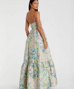 Elegance meets sophistication in this strapless A-Line gown, crafted from vibrant brocade fabric—perfect for daytime weddings, galas, and soirées.