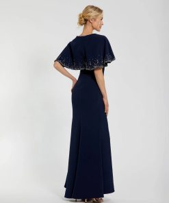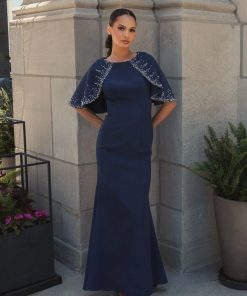 This crepe fitted gown boasts a high neckline and a stunning beaded shawl. Crafted from high-quality crepe fabric, it offers a comfortable and flattering fit, perfect for those seeking a sophisticated and refined look.