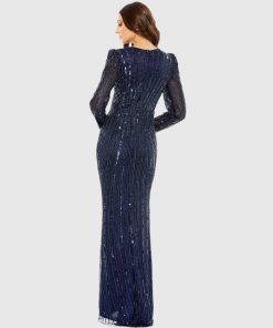 Made in an ultra-fine tulle fabric, this floor-grazing dress is embellished with rays of sequins. A sleek column shape with a high neckline and fitted long sleeves delivers a chic, contemporary look, while a beaded belt encircles your waist for a flattering fit.