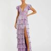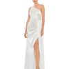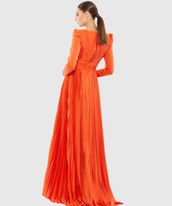 Chic faux-wrap satin gown with puffed shoulders, a v-neckline with a pleated bodice and a full-length pleated skirt.