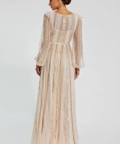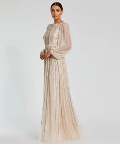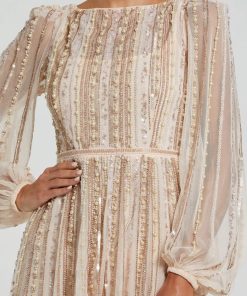 Indulge in opulent elegance with this hand-embellished gown. This stunning creation features a hand-beaded and pearl embellished sequin overlay and is enhanced with romantic sheer bishop sleeves and intricate striped pearl and sequin detailing.
