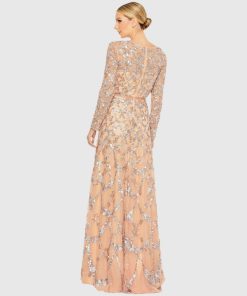 Crafted with a hand-embellished mesh overlay, this gown boasts ethereal elegance. The semi-sheer long sleeves add a touch of allure, while the beaded waist detailing creates a flattering silhouette. Perfect for any formal occasion, this gown is a timeless addition to your wardrobe.