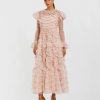 - Hand-embellished mesh overlay; 100% polyester lining