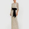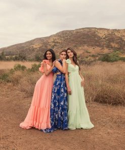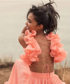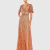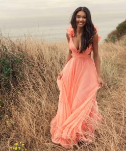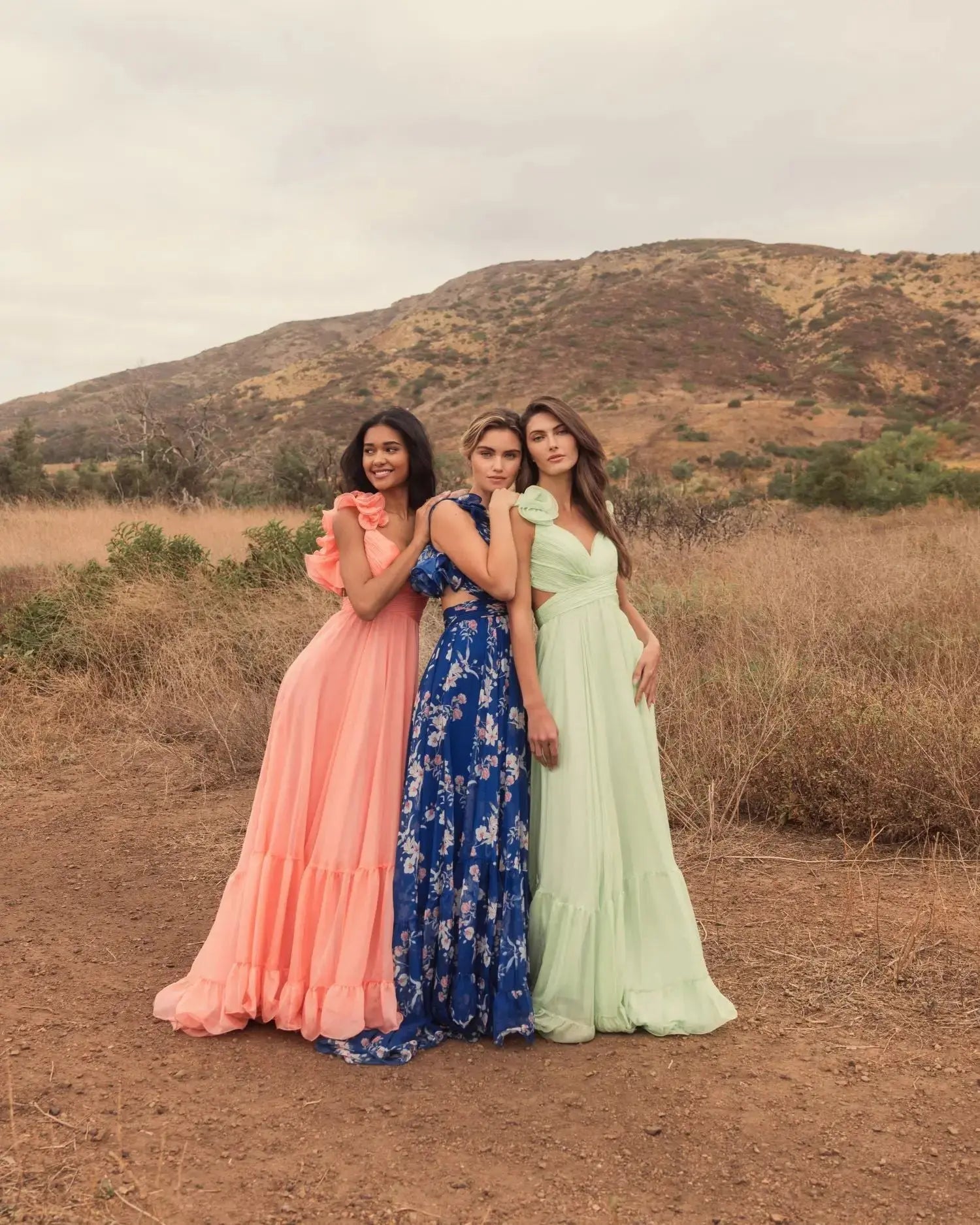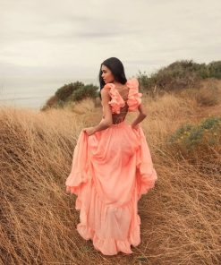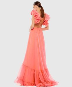 The Mac Duggal Iconic Ruffle Gown. Floor length tiered gown with sexy side cutouts, a lace-up back, and dramatic ruffles at the shoulder. This best selling silhouette is flattering on most body types and easily adjustable for the best fit.