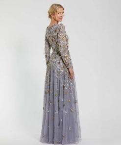 This embellished gown is a breathtaking blend of elegance and glamour. With its high neckline, long sleeves, and allover embellishments, its the perfect gown for evening affairs and black-tie events.